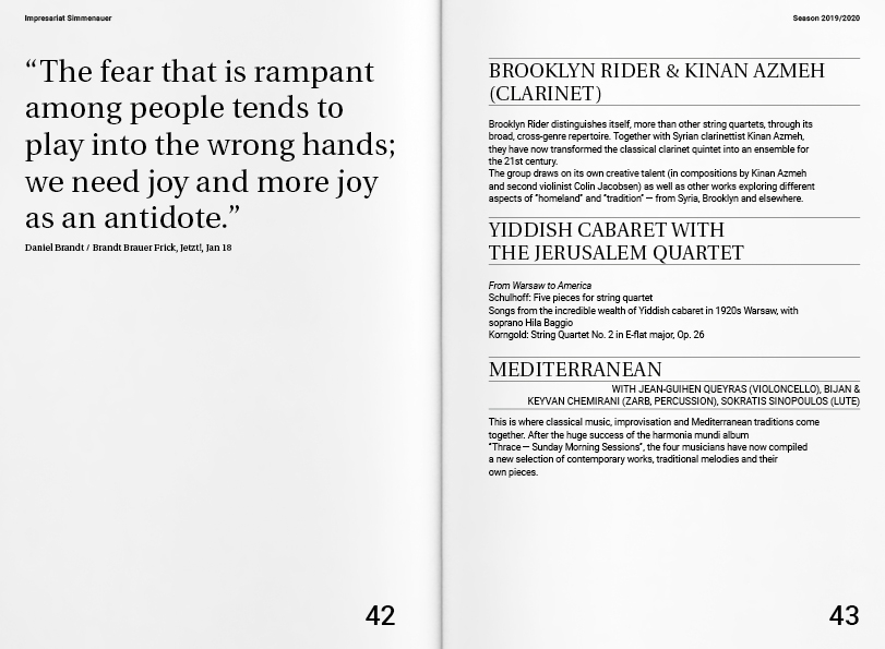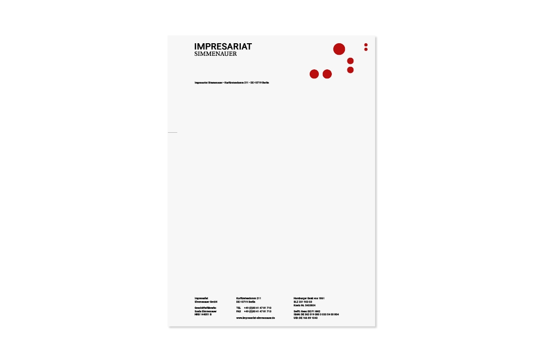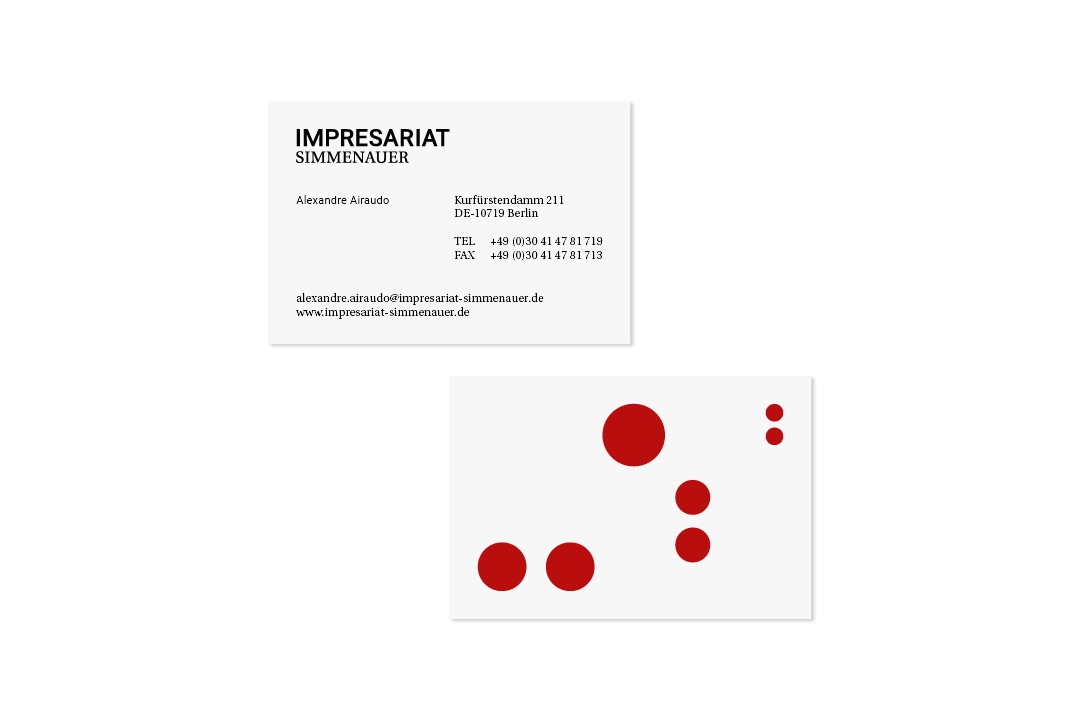 Creative Direction, Editorial DesignImpresariat Simmenauer is an agency for classical musicians with a rich heritage but also a progressive strategy, representing artists like Brandt Brauer Frick. Studio von Monkiewitsch were commissioned to design a new logo and a corporate identity for the agency. Evolving into a family business with the recent entry of Sonia Simmenauer’s son, the new visual identity strives to be an update that reflects the forward-looking and thinking of the agency. We took the old clef logo as the origin for the new logo and reduced it to just the dots - like a familiar tune with a new beat. The minimal language of the logo allows for flexible use, as our designs of their seasonal leaflet, letterhead and business cards show.