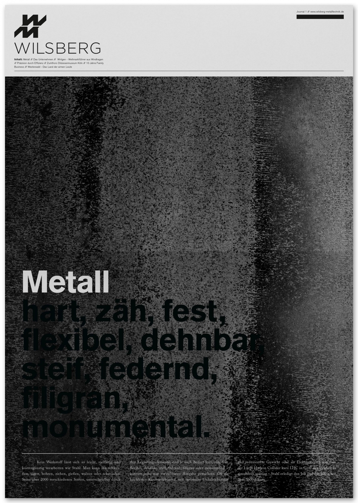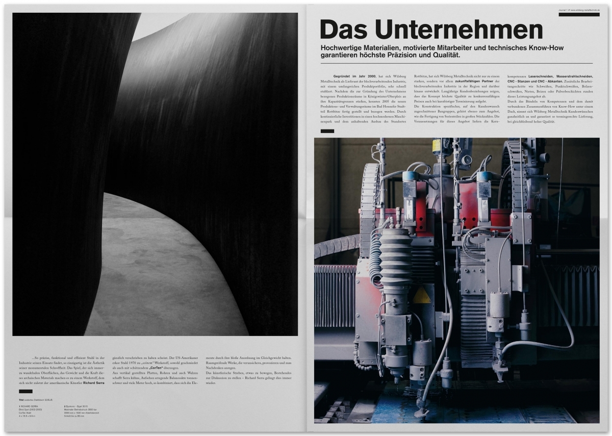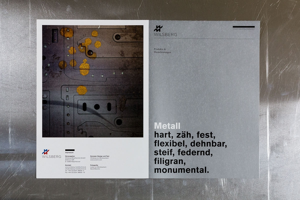Art Direction, Editorial Design, Webdesign, Web Development, PhotographySeit 2012 begleitet Studio von Monkiewitsch das Unternehmen Wilsberg Metalltechnik in jeglicher gestalterischer und kommunikativer Hinsicht. Von Printmedien über Webdesign und Fotografie wurde eine klare, dem Unternehmen individuell zustehende, visuelle Sprache gegeben.